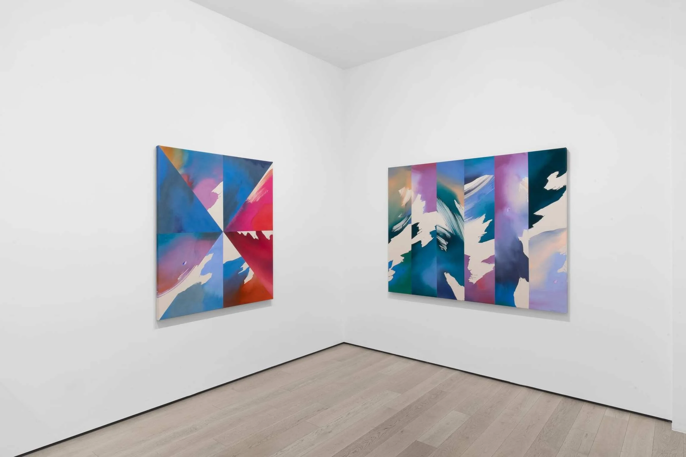 Included here for the first time are three paintings that introduce a new radial composition in Day’s body of cut works. Vertically oriented, the configurations resemble the layout of a clock, with triangular sections extending from a central point. In Turning Sky, sections of fuchsia, cerulean blue, deep purples, and cranberry red all meet at the center of the canvas. At the upper right, a polygon of light blue rimmed by red and purple flanks another panel that features a darker spattering of crimson with an undulating boundary that reveals a section of blank space.