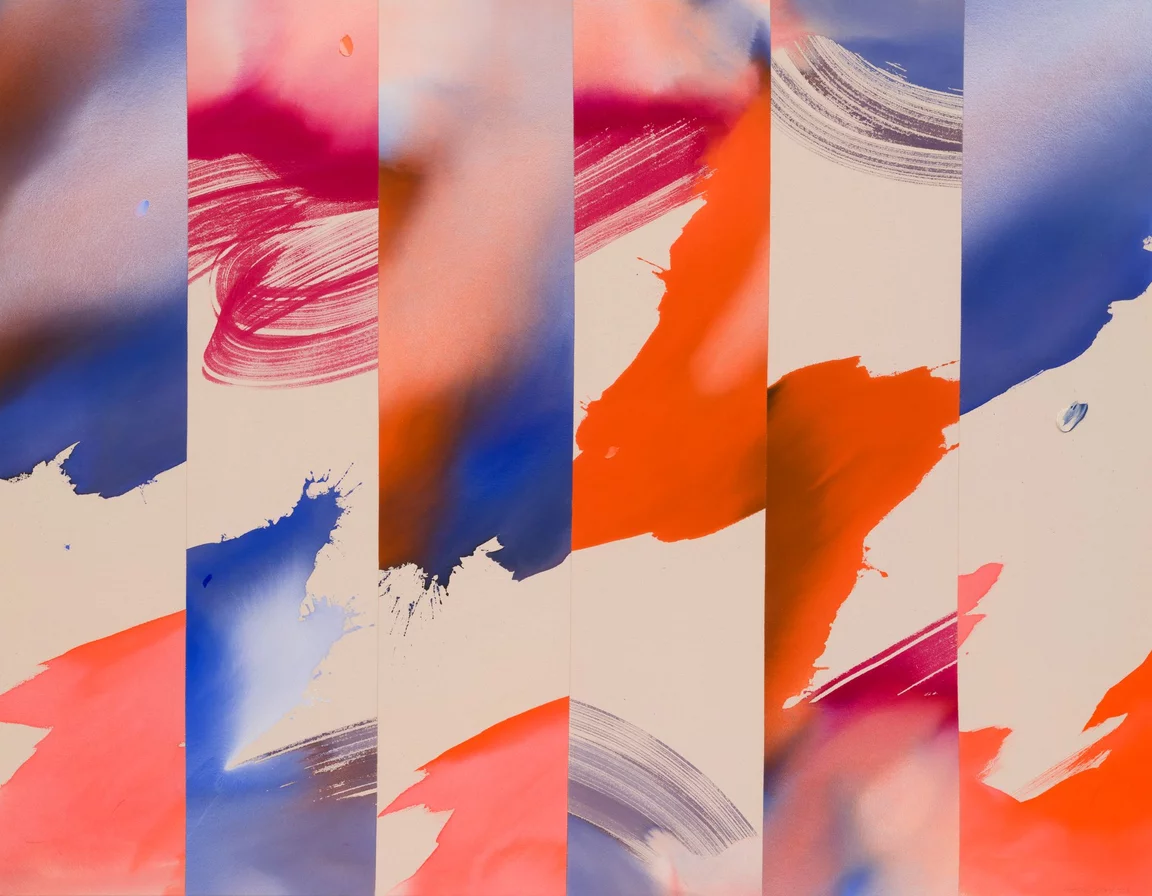 After completing the application of paint, Day cuts the works into long columns or vectors that she will reassemble and sew into entirely new compositions. In Magenta Window, six long vertical bays are sutured side by side, giving the piece a flickering, animated quality. Swoops of magenta are brusquely chopped, their edges butting up against hazy pools of cobalt blue and cadmium orange. The union of each strip laid side by side creates tension and energy between the recorded gestures. Day deconstructs the supposedly unimpeachable canvas surface, breaking up expected painterly tropes, and rejoining them in polyphonic connections.