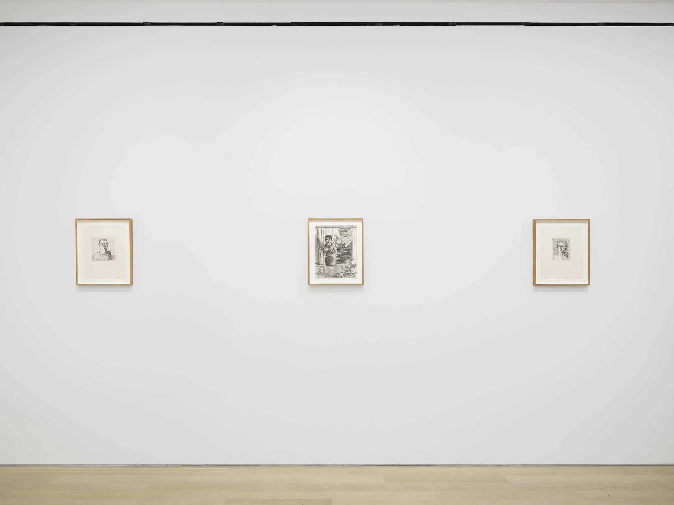 Above all, she emphasizes the eyes, rendering them enormous with heavy lids and puffy bags—tired, sleepless, cried-out eyes. Noses are narrow but bulbous-tipped, reddened as though from the cold or that good cry. Mouths are tight and compact, occasionally so demur as to begin to disappear under the domineering force of nose, ears, and eyes. Heads, as a whole, tend to be oversized, childlike in proportion to their bodies, and often flattened on top, as though succumbing to a pressure from above.