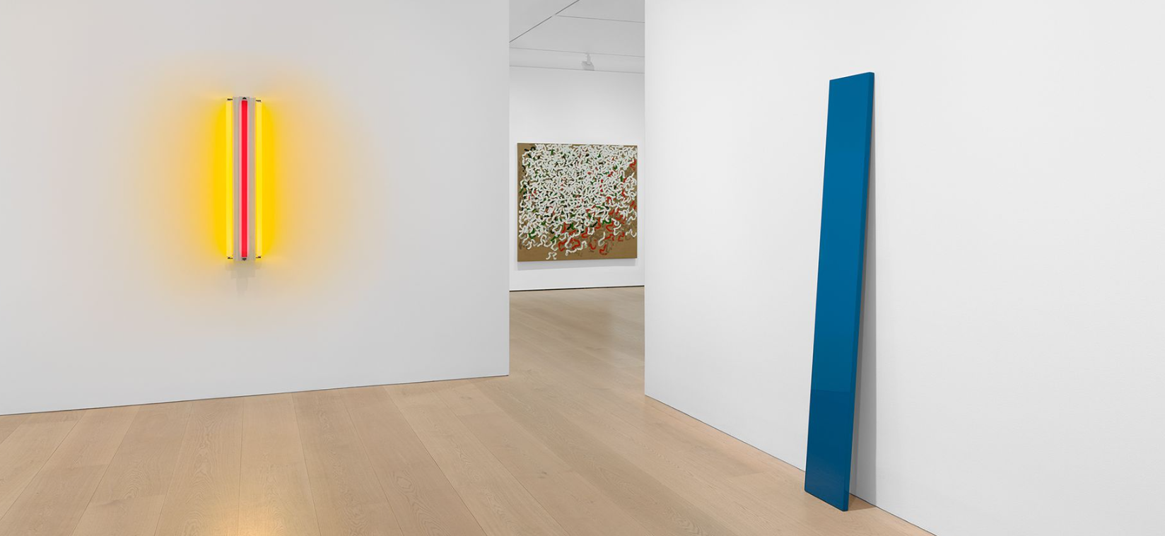 Among the works on view are Flavin’s three fluorescent tubes (1963), a rarely seen early work that was the artist’s first to incorporate more than one lamp, and his first multi-colored construction using light; a major untitled set of twenty woodcuts by Judd that use colour to iterate variations across a single compositional format; as well as two planks by McCracken—the artist’s signature sculptural form—that are executed in highly glossed red and blue and exemplify his long-standing interest in the transcendent potential of minimalist abstraction.