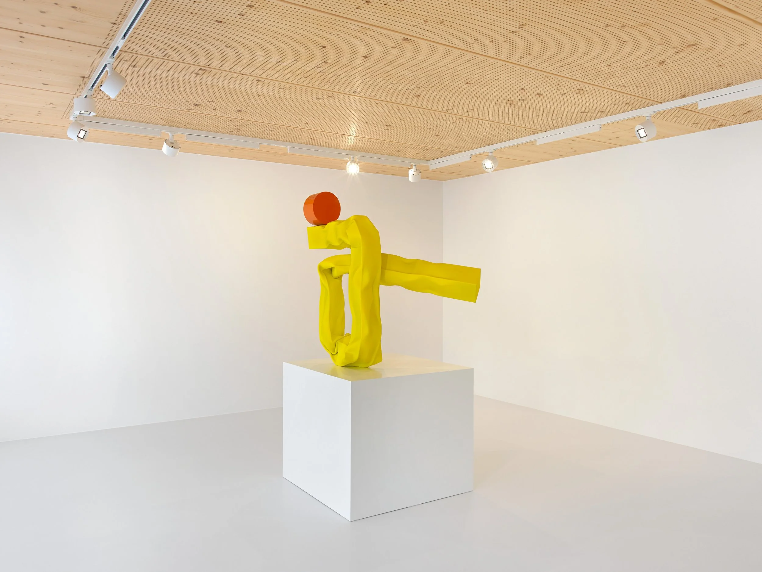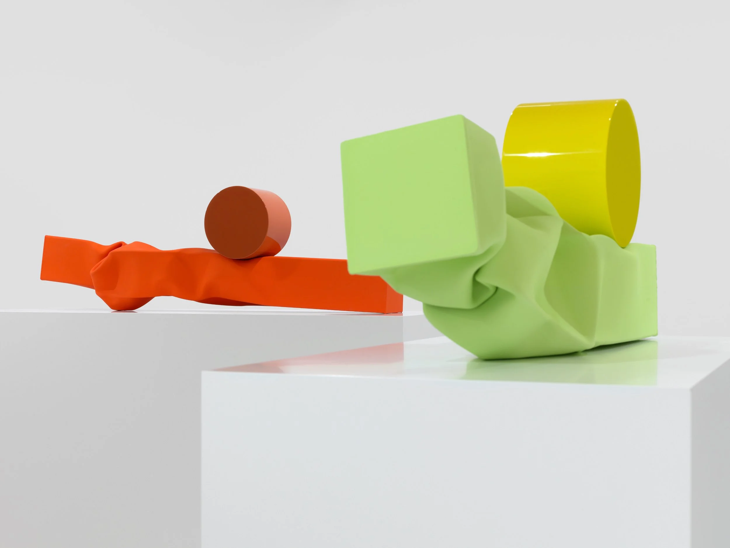 The Machine Age features a group of abstract sculptures that juxtapose contorted tubes of steel with highly reflective, perfectly finished closed cylinders made from the same material. The tubes’ matte urethane paint finish lends their forms a deceptive impression of malleability and lightness, while their punctuation by squat, glossy “polka dot” cylinders hints at disparate styles including Art Deco, Memphis, and Minimalism. The works’ irregular forms and tempered surfaces also contribute to a subtly anthropomorphic quality, suggesting single reclining figures, or perhaps the erotic union of pairs. The exhibition design makes playful use of the gallery’s two different elevations to facilitate a range of possible sight lines.