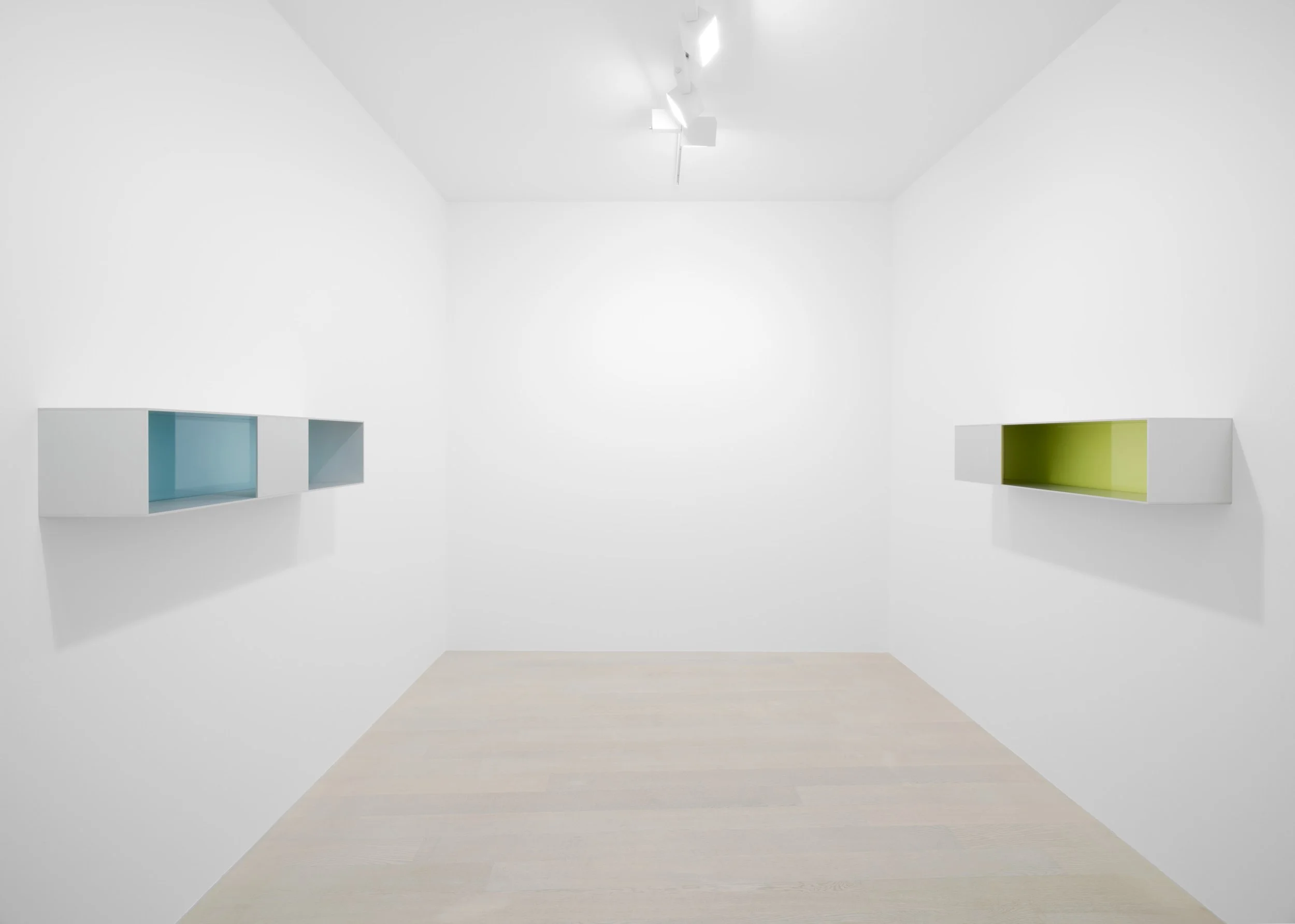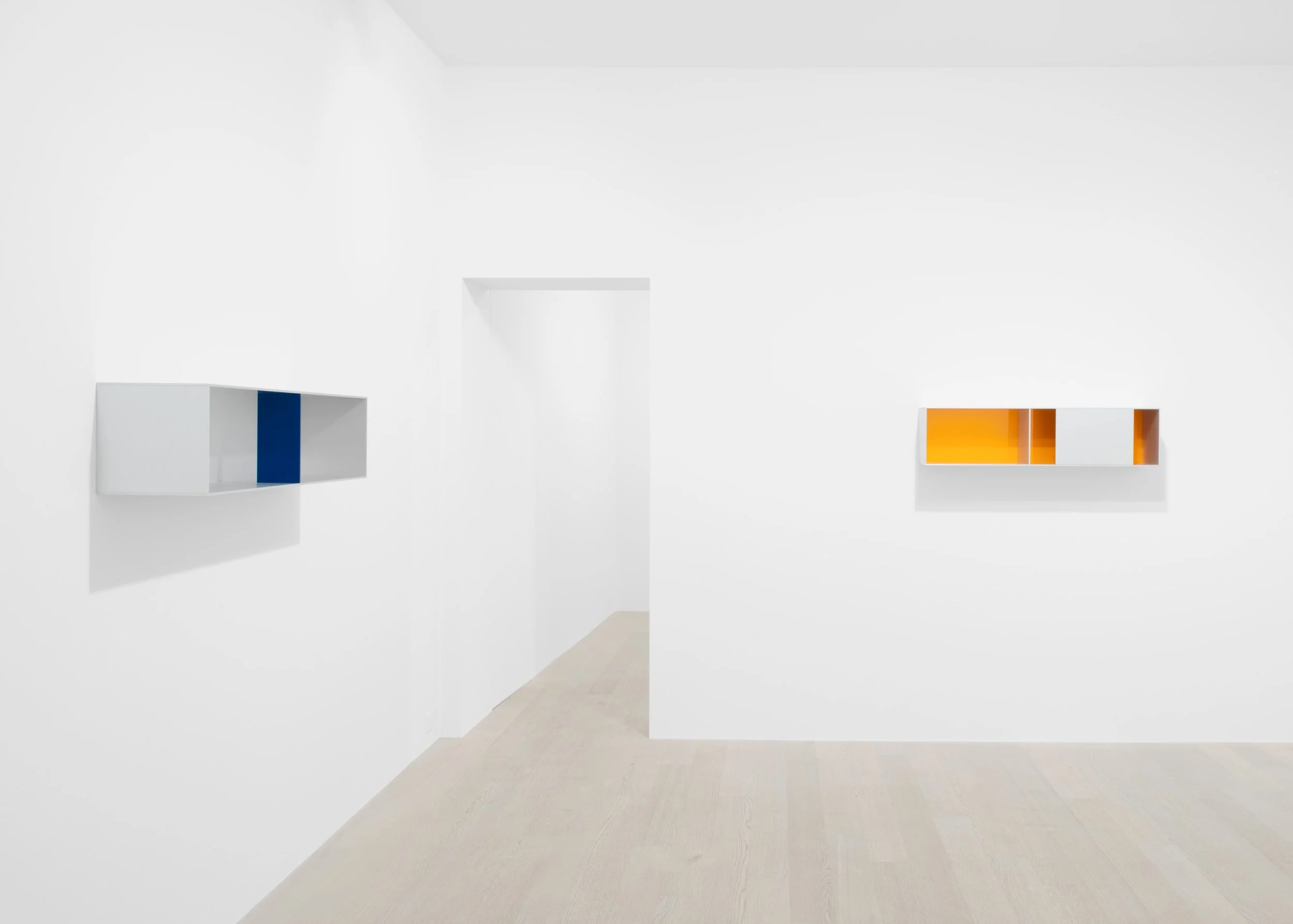 The compositions are bisected by aluminum sheets, with some works partitioned by aluminum planes on their front-facing surfaces. Orchestrating subtle and dramatic interplays of light, shadow, and color, the pieces investigate space, color, and existence—for Judd, the main concerns of art.