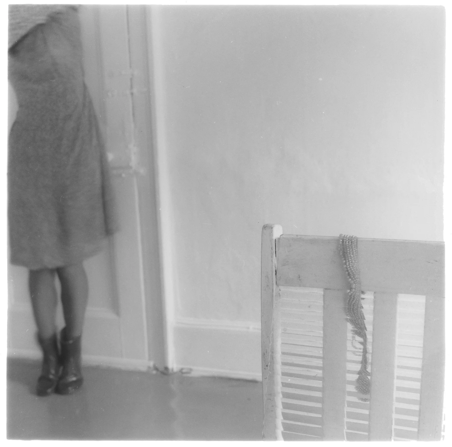 With her skirt sitting low on her waist and blurred by a gentle movement captured by the camera, the photograph anticipates Woodman’s preoccupation with caryatids and the body as sculpture. The same can be seen in earlier works, such as From Space² or Space² (1976), in which a figure emerges from behind torn wallpaper.