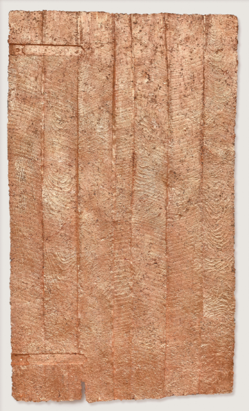 Traditionally used as a preliminary mold for sculptures or children's projects, papier-mâché has a recycled composition that invites a dialogue with the past while providing a tool for creation. As a young artist, Whiteread used the materiality of paper in her transition from painting to sculpture; in Substitute, it continues to serve as a link between the two disciplines. The highly textured surfaces of these works are also imbued with traces of their own history, while the finishes evoke the sensation of cold metal in unexpected tones.