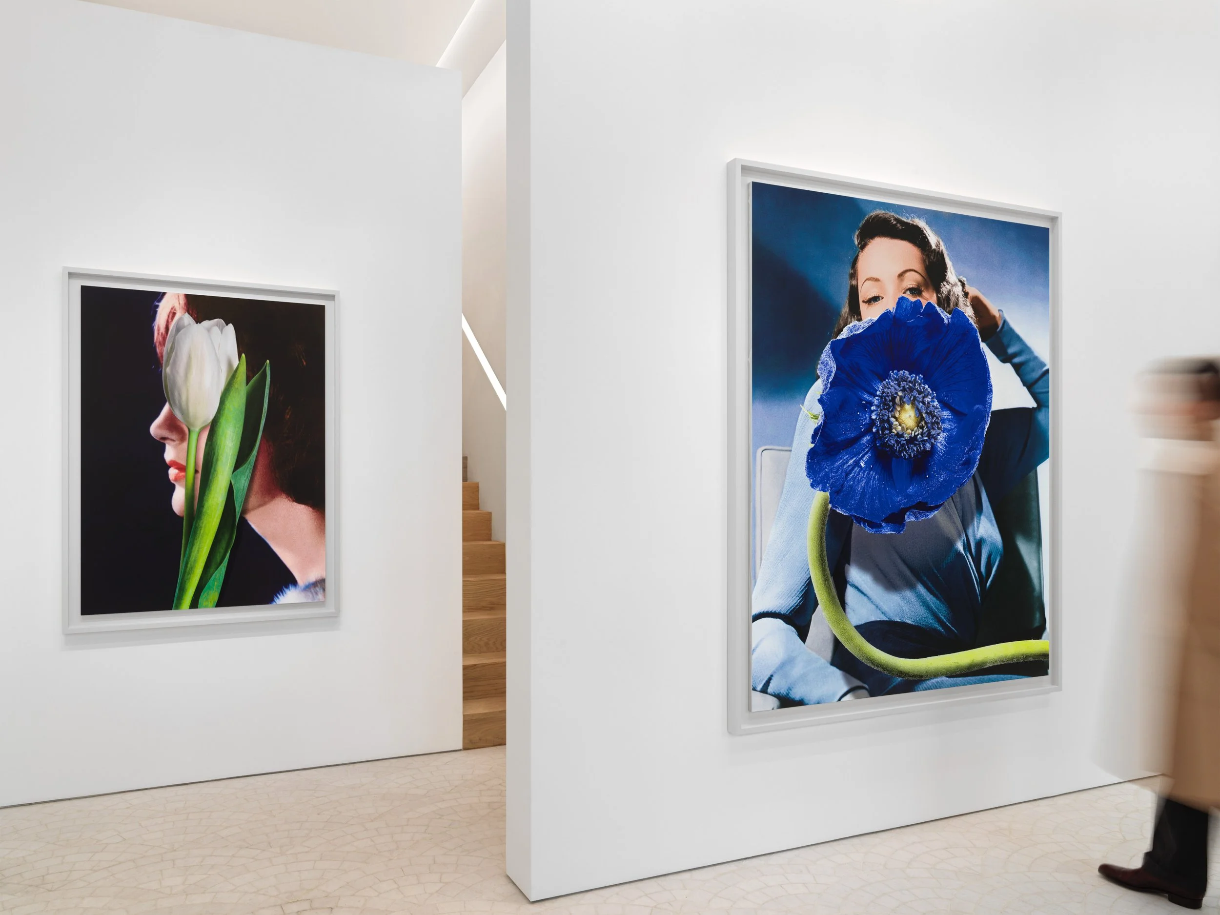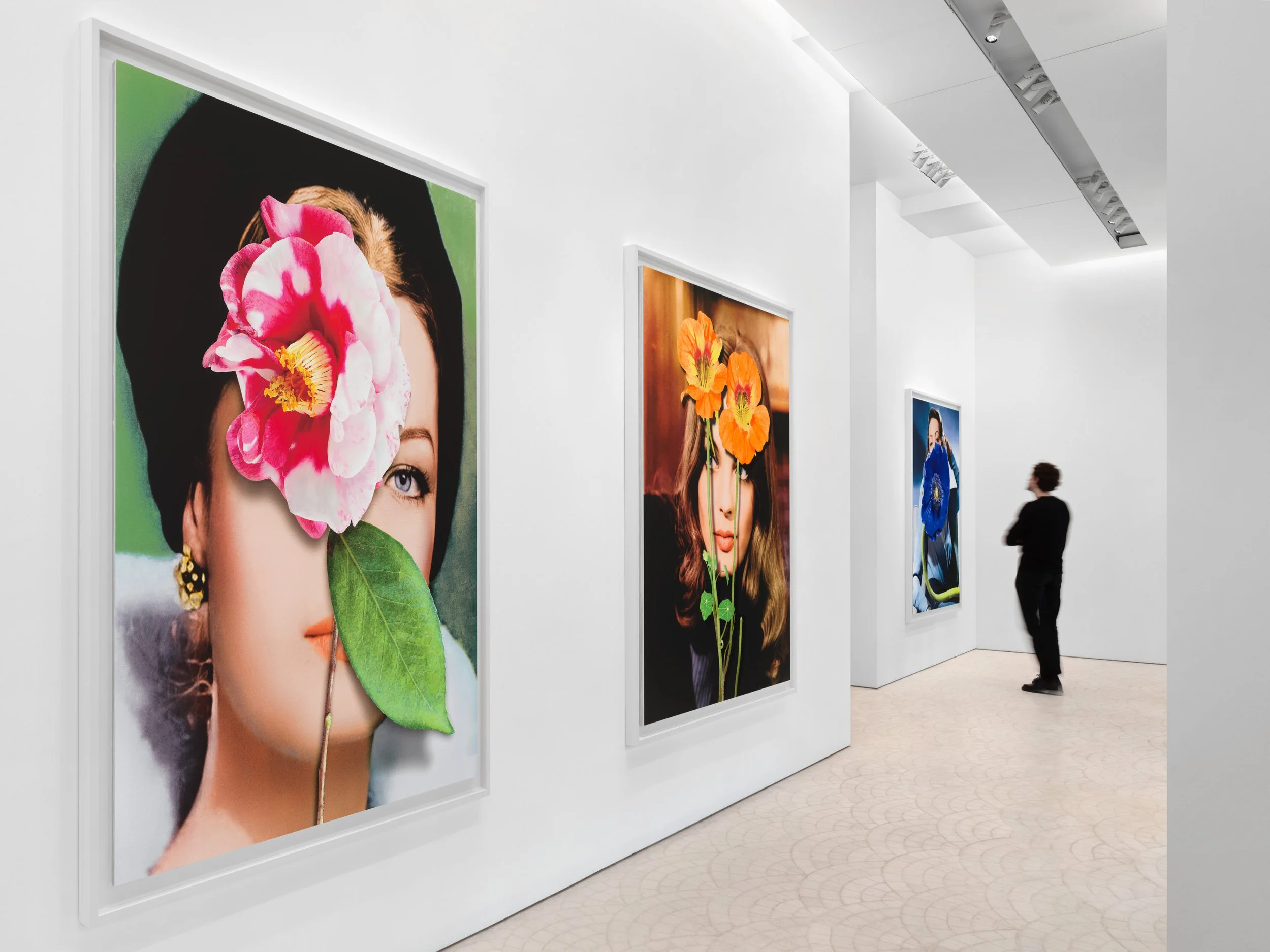 The subjects’ eyes gleam with mystery, while the vibrant colors of the blooms reflect the women’s enigmatic hidden depths. Fischer’s witty clash of images summons the romantic and sexual associations of flowers while hinting at the ephemeral character of glamour and fame; it also evokes the mustache that Marcel Duchamp penciled onto a postcard reproduction of the Mona Lisa in L.H.O.O.Q. or La Joconde (1919).