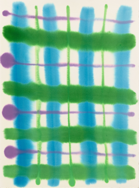 Across the ‘Plaids’, formal rigidity is set in tension with the mercurial fluidity of watercolour. Painting wet-into-wet onto large, soaked sheets placed directly on the floor, Weaver describes how ‘each mark becomes an index of the body’. Bold lines of colour overlay and interact as rivulets of paint pool, bleed and bloom across the surface of the paper, seeping into its fibres. Attentive to the idiosyncrasies of particular pigments, whereby their varying densities impact mark making, Weaver describes how ‘the lines interfere with each other in that short window of drying time, bleeding together, squeezing or pushing one another out of the way, so that the final image has the sensation of breathing or pulsing’. Once dry, the implied chronology of ‘woven’ paint – downstrokes intersected with horizontal bands of pigment – collapses into the work’s unified painterly surface. In this way the ‘Plaids’ carry an inflection of duration, with each work containing the moment of its making.