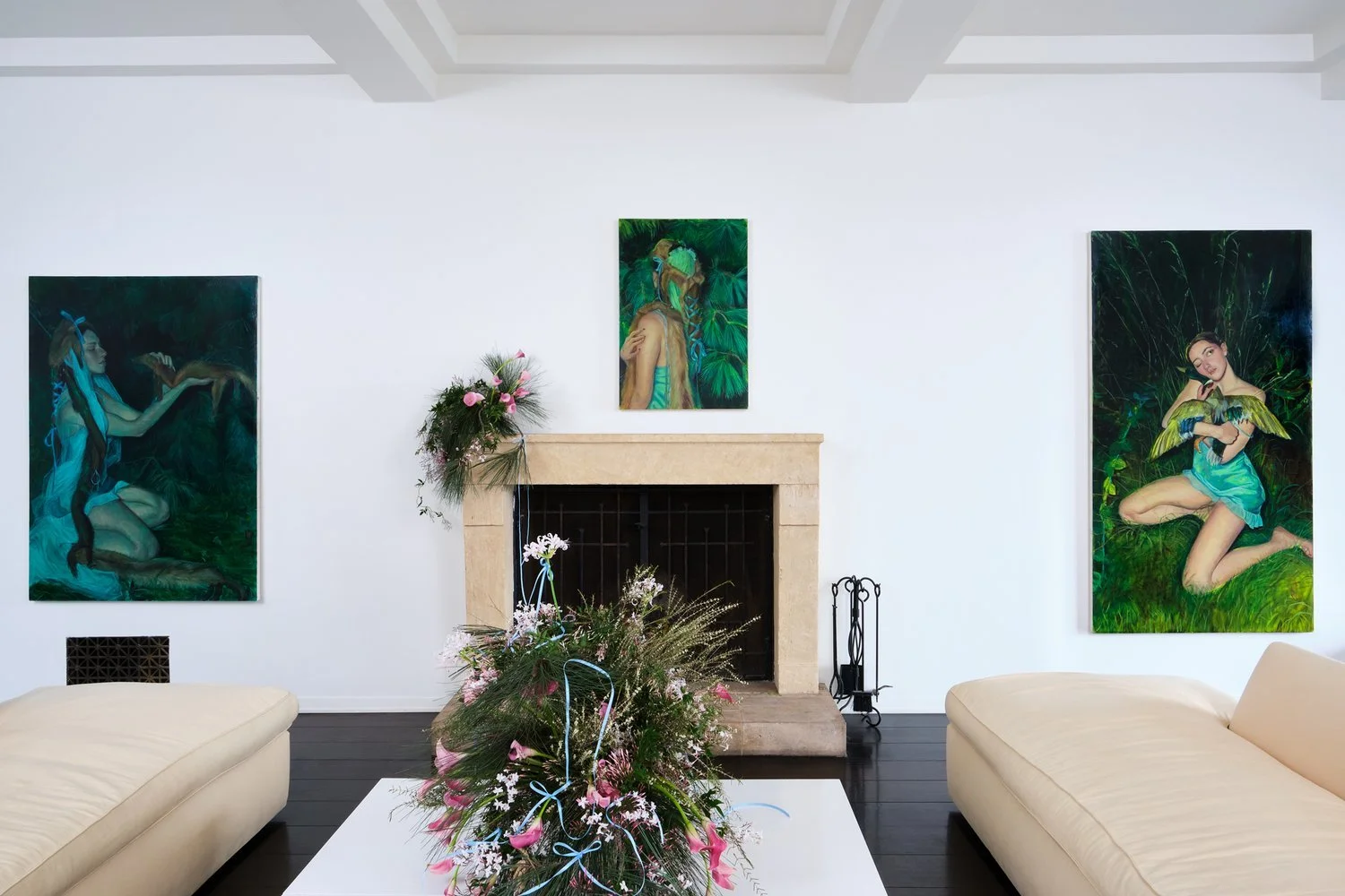 While the women depicted in the paintings are not actively engaged in hunting, the ambiguity surrounding their relationship to the prey creates an atmosphere of suspense and unease. Using luminous surfaces and vibrant yellows, the paintings evoke a sense of hypervigilance, a sense of impending doom, and a need for protection.