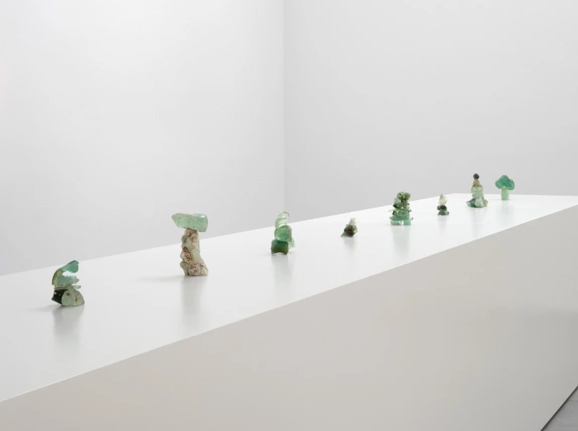Before becoming associated with steel, Pittsburgh, which has been Mosley’s home for eight decades, was known as the center of the glass industry in the United States—in 1926, when the artist was born, the city made about eighty percent of the country’s glass. Mosley’s use of this found material with a local history relates to his practice of salvaging wood from Pittsburgh’s forestry division and nearby lumber mills. With these glass sculptures, the artist chose pieces that are at turns crystalline and cloudy, ranging in surface texture from burnished smooth to jagged like the face of a cliff. Their palette—familiar to anyone who has combed shorelines for sea glass—is made up of an array of scintillating greens and blues. While Mosley’s rippling wood surfaces catch and reflect light, the glass sculptures refract it, revealing the bubbles and striations that mark their interiors and casting an almost transcendental glow on their surrounds. Mosley’s guiding principle of “weight in space” remains key: despite the apparently precarious arrangements of glass elements, these sculptures remain stable, balanced through the artist’s careful calibration of mass and gravity.