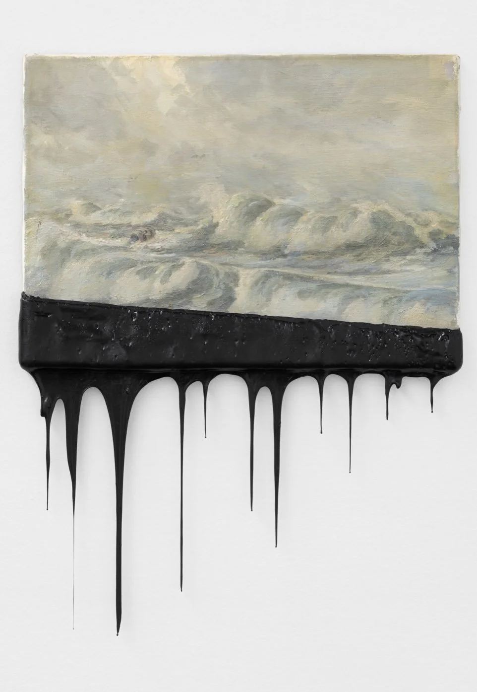 Minerva Cuevas’s intervened seascapes retain the familiar line where ocean meets sky while contrasting a romanticized conception of nature with a natural element. Along the lower edge of the paintings, chapopote—a dense, tar-like petroleum—accumulates and drips beyond the canvas. This material disrupts the reading of an otherwise conventional scene, foregrounding its physical presence. The use of petroleum inevitably recalls the environmental realities of oil extraction. At the same time, the black horizons become sites of tension between the material’s alluring texture and the idealized beauty historically associated with landscape painting.