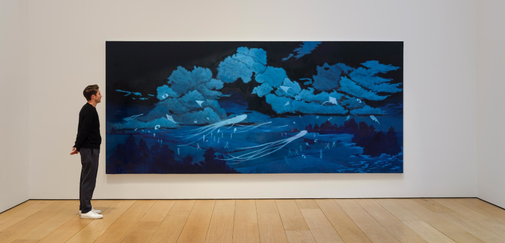 Chambers’ omission of any buildings or landmarks in this series creates a sense of privacy, and none of his figures engage the viewer. In the titular painting Leave Room for the Wind, a pair of children race across a blue-green field trailed by a set of translucent kites, while in another work two young boys stand still, flying blue, yellow, and purple kites across a pink-red sky.