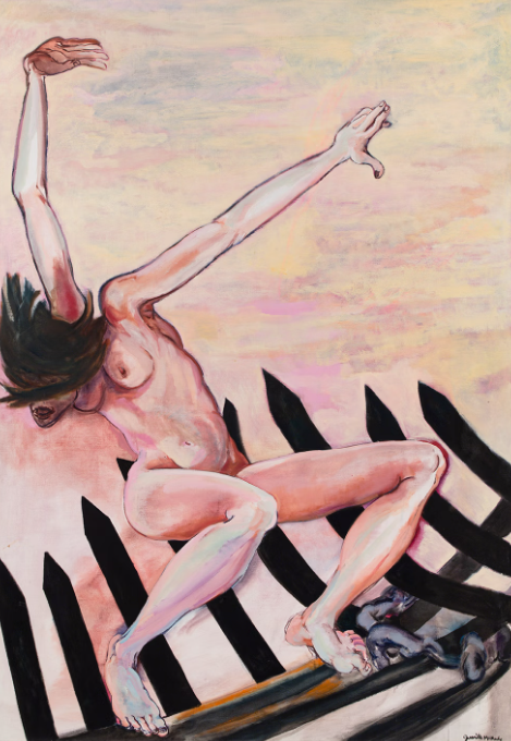 The works on view in the exhibition reflect McNeely’s lifelong commitment to channeling emotional, physical, and social conditions. Paintings from the late ’60s reveal her confident command of color and line—as in The Yellow Womb (1969), where intensely saturated hues animate a composition of fragmenting body parts, infusing each element with a sense of expanding vibrancy. Difficult subjects and provocative motifs are treated with seductive delicacy and care, balancing realistic detail with expressive and gestural brushwork. In later decades, McNeely developed the Windows series, represented here by Umbrella Inside (1980–2011). The series saw the artist establish her use of windows, metal bars, and spiked grills as framing devices, structures that simultaneously enclose the figure and destabilize the pictorial space. By the ’90s, such motifs were absorbed into scenes of sensuality and domesticity, signaling both an integration of earlier constraints and their transformation. At times, as in Balance (2012), the objects themselves dissolve, giving way to resonant and immersive fields of empty space. Throughout the works on display, the painted surface is revealed as an ambiguous yet exciting site of both confinement and resistance.