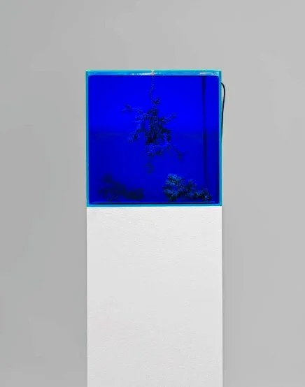 At the center of the exhibition are Uncomputables (2026), an installation, and Unthoughtforms (2026), a set of suspended sculptures. Both are inspired by the experiments of British cybernetician Gordon Pask, who believed living systems can solve problems in ways that exceed human thinking. Pask developed “chemical computers”—electrochemical systems that modeled aspects of the brain and social organizations. He conceived computational problem-solving as a physical process in which solutions emerge through chemical interactions rather than abstract calculations. In his experiments, he grew metal crystals in copper sulfate solutions by passing electric currents through electrodes to form branching filaments in self-organizing feedback systems. Kurant reactivates these experiments in an aquarium where metal, tree-like forms grow in response to AI-harvested real-world socio-political and economic data, which are parsed and converted into electric current flows and sound vibrations by a computer-controlled system. Each structure records an emergent idea or solution as a physical abstract form—a crystallization of something yet unthought.