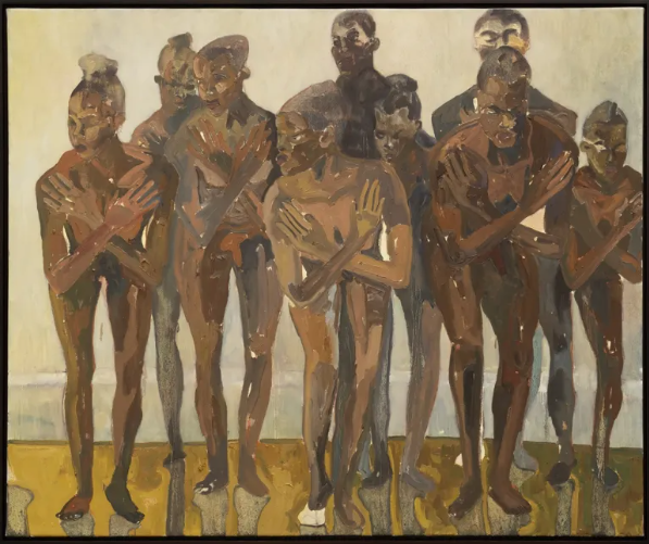 The now in Nkoth’s work is captured not only in his figures’ gestures, but in the act of creation itself. The artist becomes both observer and participant, filtering a world marked by political unrest, social upheaval, and inner searching through the discipline of the body. He often begins with his own body - filmed, posed, documented - before translating it into paint. “I exist in both spaces,” he explains, “the observer and the performer.”