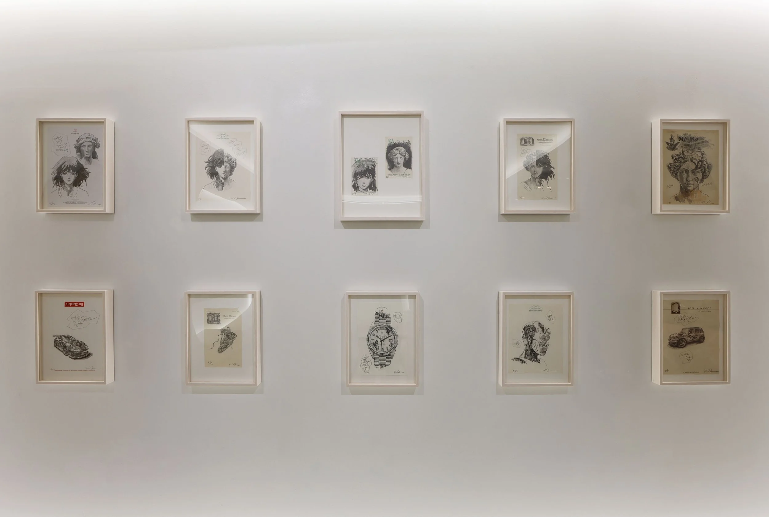 The exhibition comprises works such as "Fractured Idols," where Arsham juxtaposes images of Classical Antiquity busts and anime characters from different eras, "Anatopism" painting series depicting eroded colossi, cars, and characters discovered from caves, and "Hotel Stationary Sketches," a drawing series Arsham has continued to create as an archive of travel since the early days of his career.