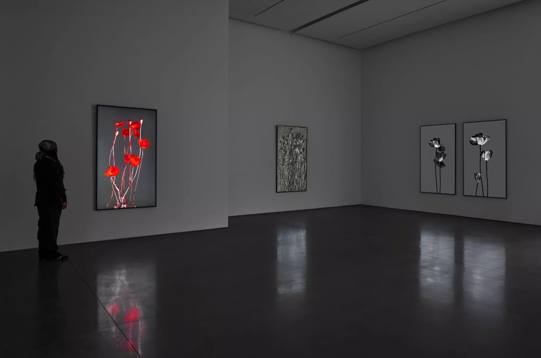 The ongoing war has impacted the artist’s perspective on her Pragim works, as they now also powerfully reflect the state of unrest and anguish afflicting the region. Using a dark palette of black, gray, and red, the artist imbues her human-scale staccato swaying poppies with harsh and tragic qualities.