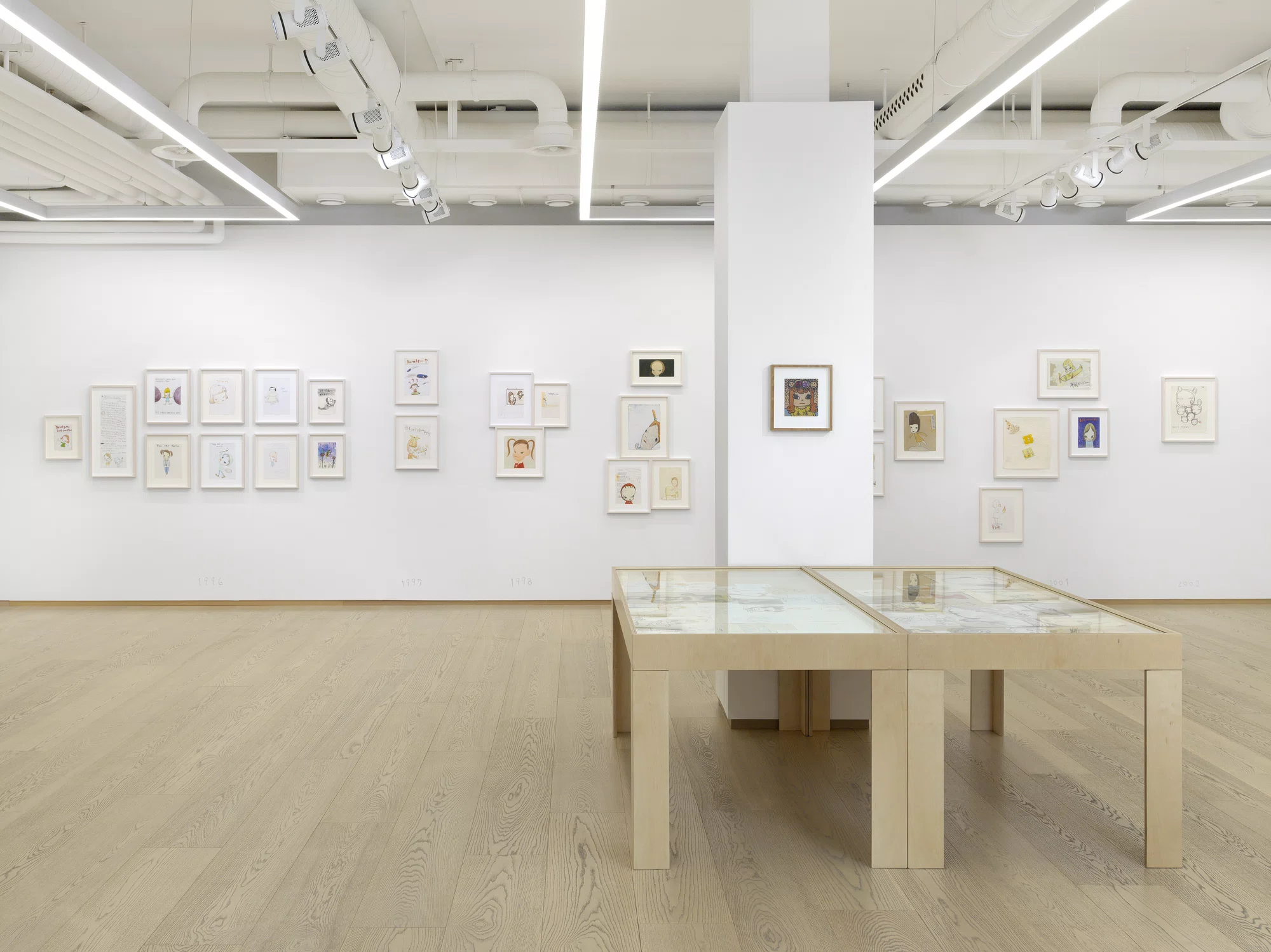 Created in notebooks and on found materials ranging from corrugated cardboard to envelopes and newspapers, Nara’s spontaneous drawings featuring youthful figures, anthropomorphised animals, song lyrics, and expletives are fundamentally intimate reflections of his psychological landscape. In Nara’s hands, aesthetic signifiers of youth—like large heads and wide eyes—tap into complex emotions and psychic states, from rebellious and resistant to quiet, contemplative, and lonely.