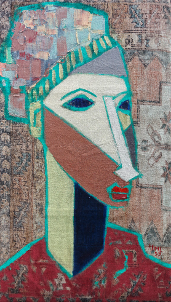 In terms of selected works, a distinctive material dimension runs through the exhibition: several works are painted on kilim rugs, whose woven patterns and earthy textures become active participants in each composition. The geometric motifs of the rugs resonate with the ancestral rhythms of the paintings, creating a layered dialogue between surface, heritage, and gesture.