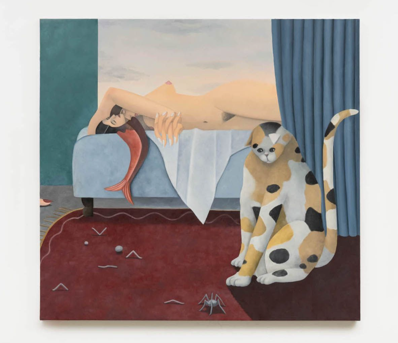 In Fun and Games (2023) a single, sleeping, female – a pert breast rising like a small mountain on the horizon – has two heads, one of which rests on a large, ochre-red fish. At the centre of the image, two hands, with long identical fingers, clutch each other; another red fingernail is visible to the left. Like a sentry guarding the woman, a large, mottled, cat-like creature in the foreground calmly observes two spiders, one intact, the other with its legs torn off and scattered around its body.