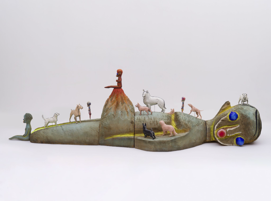 Both primitive and pop, the simple geometries and biomorphic shapes Kato uses to compose his distinctive figures seem to nod at the elemental forms found in petroglyphs and cave paintings, while also channeling the character-driven aesthetic of contemporary culture. He uses timeless natural materials such as wood and stone alongside manufactured creations such as plastic and vinyl.