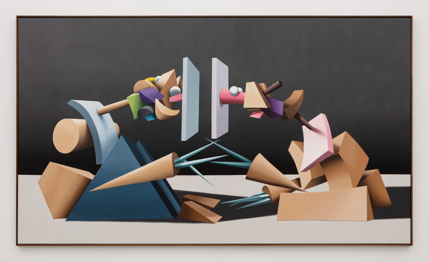 Kinsella demands a neat order to his imagined sitters. They are built from distinct units whose contours, color and form betray their personalities, their quirks, their annoyances, their faults. They’re more ordered than a human face, except not really. Faces follow a certain logic and so too do Kinsella’s. Even though Kinsella’s portraits are personal readings of friends and acquaintances, he insists there’s no Rosetta Stone to his language. Still, it’s easy to imagine a sphere indicating a quickness to anger, or an upturned ellipsoid signifying a tendency toward making jokes to mask pain.