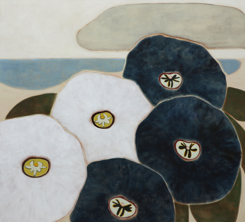 Applying art historian Leo Steinberg’s 1968 distinction between the vertical “window” model of painting and the horizontal flatbed picture plane (originally developed in relation to Robert Rauschenberg’s work), it becomes evident that Susumu Kamijo’s practice aligns with the latter. His inclusion of landscape elements follows an intuitive logic, focused entirely on exploring the flatness of the pictorial surface. The artist explains, “If I sense that something is needed in that spot, I might add a cloud, and that helps maintain the composition’s equilibrium.” His chromatic choices follow a similar pattern: certain colors and color combinations draw him in, not for their representational value, but for their ability to organize the painted surface and create visual and emotional effects. The large, recurring flowers function primarily as formal devices. The artist describes their inherent dynamism as a principle of outward expansion radiating from a central point. In short, the flower is an intriguing motif because it carves out its own space. “Like a big bang, a nebula,” he adds.