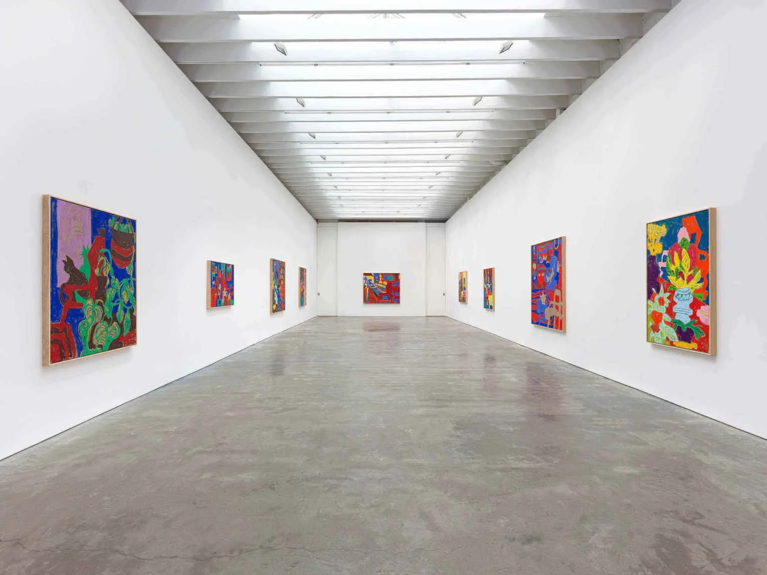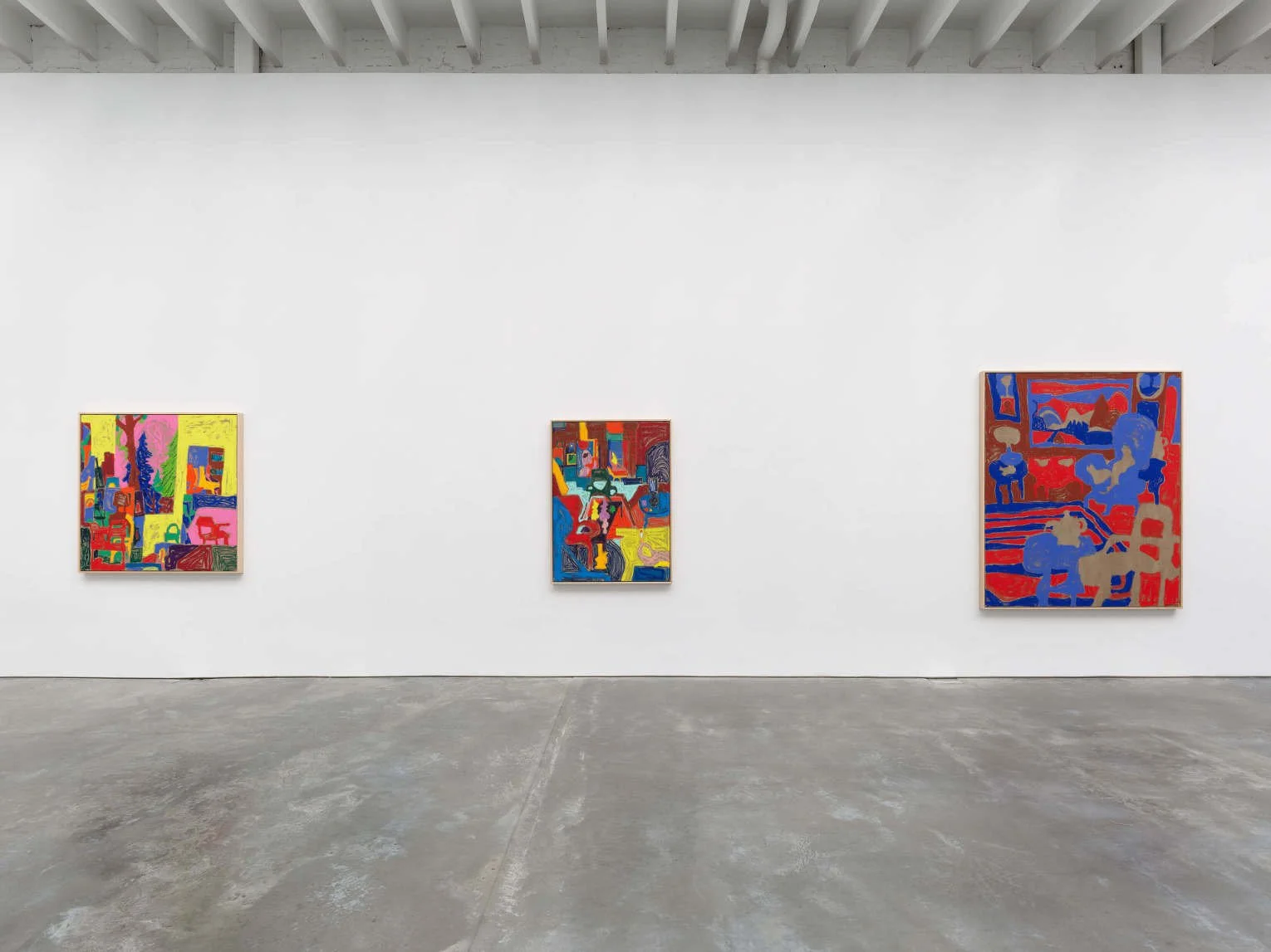These largely unpopulated or solitary spaces exude a meditative calm: long hallways, slanted rooms, paintings within paintings, all humming with a vibrant humanity that underpins the lively linework. These paintings verge on—and lean into—the edge of abstraction, and James’ influences for these works can be traced to Fauvism, subway graffiti letterforms of the 1970s, and the CoBrA movement of the mid-twentieth century.