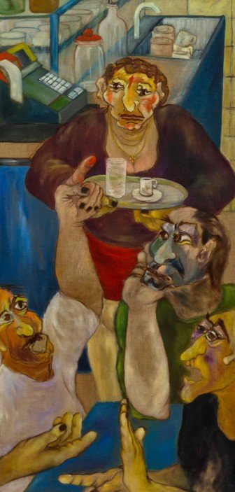 Throughout art history bar scenes have mined the intense choreography of social interaction for which a bar provides a stage. Christou, like Gilroy and Hogarth, like French Impressionists Toulouse-Lautrec, Degas and Manet, as well as the Neue Wilde German painters like Immendorf and Kippenberger who she knew, captures the joy and tragedy of the tavern’s intoxicating, atmospheric, dynamic.