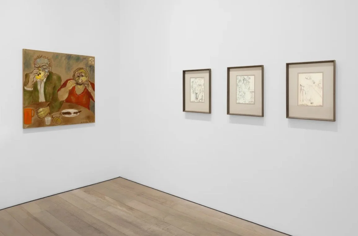 The paintings in this exhibition take cues from the winding streets of Psirri (Athens) and the ubiquitous gatherings Christou observed in her local urban epicentres. The works focus on Greek kafeneia – cafés or coffee shops serving a mix of ouzo, retsina, strong coffee and meze in simple, informal settings – and kreatagores – bustling markets or butchers’ shops that offer a place to eat, gather or wait. Christou was interested in the people overlooked in her neighbourhoods, the marginal characters she passed every day, indiscriminate in her choice of protagonist. In The end of the relationship, Kafeneia (1992), a hanging mirror reflects the shared table, magnifying the strewn leftovers and spilled digestifs symbolic of a broken relationship. In her unromanticised depictions of observed subjects, her paintings maintain compassion, vibrancy and a palpable energy. Groups of women, or geinaikes, inhabit many of Christou’s works, dominating café and market scenes of shared meals, card games, smoking, drinking and slow-paced communion. The intergenerational grouping in Untitled (Kafeneia Women’s Table A. with Friends) (1991) illustrates how these non-domestic spaces are platforms for camaraderie, independence and performance.