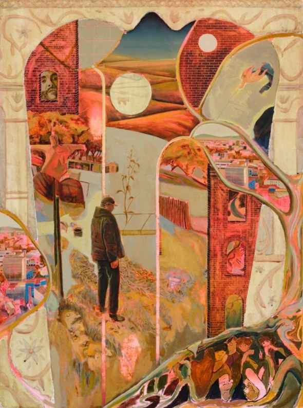 Caleb Hahne Quintana’s atmospheric paintings trace displacement across emotional terrain, where figures dissolve into fields of color and distance.